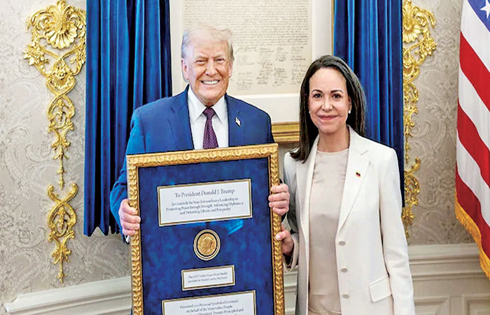 વોશિંગ્ટન : વેનેઝુએલાની વિપક્ષની નેતા મારિયા કોરિના મચાડોએ તેને મળેલું નોબેલ પીસ પ્રાઇઝ અમેરિકન પ્રમુખ ડોનાલ્ડ ટ્રમ્પને આપ્યું હતું. ટ્રમ્પે તેને પારસ્પરિક સન્માનની સુંદર અભિવ્યક્તિ ગણાવી હતી. જો કે નોબેલ પીસ પ્રાઇઝ કમિટીએ વિરોધ કરતાં જણાવ્યું હતું કે આ રીતે કોઈ તેમનું ઇનામ બીજાને ન આપી શકે. મચાડો પહેલા ઘણી વખત કહી ચૂકી છે કે તે ટ્રમ્પને તેનું નોબેલ પીસ પ્રાઇઝ આપશે.