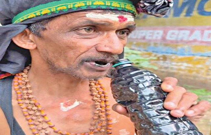 આપણી વાત કોઈ ન માને તો આપણે ગુસ્સામાં કહેતા હોઈએ છીએ કે તેલ પીવા જા... પણ ખરેખર કોઈ તેલ પીને જીવતો હોય એ જાણીને ખરેખર નવાઈ લાગે. કર્ણાટકના શિવમોગા જિલ્લામાં રહેતો એક અજબ શખ્સ છેલ્લાં ૩૦ વર્ષથી એન્જિન ઓઈલ પીને જ જીવે છે. ઓઈલમેન તરીકે ઓળખાતો આ આદમી કહે છે કે તેને માથે ભગવાન અયપ્પાના આશીર્વાદ જ છે, નહીંતર ખાધાપીધા વગર માત્ર એન્જિન ઓઈલ પીને કોણ જીવી શકે?