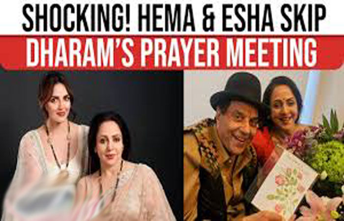 મુંબઈ - થોડા દિવસો પહેલાં અવસાન પામેલા પીઢ કલાકાર ધર્મેન્દ્રની મુંબઈના બાન્દ્રામાં તેમના દીકરાઓ સની તથા બોબી દેઓલ દ્વારા યોજાયેલી એક પ્રાર્થના સભામાં ધર્મેન્દ્રની બીજી પત્ની હેમા માલિની તથા તેની દીકરીઓ ઈશા તથા આહનાની ગેરહાજરી ચર્ચાનો વિષય બની છે.
