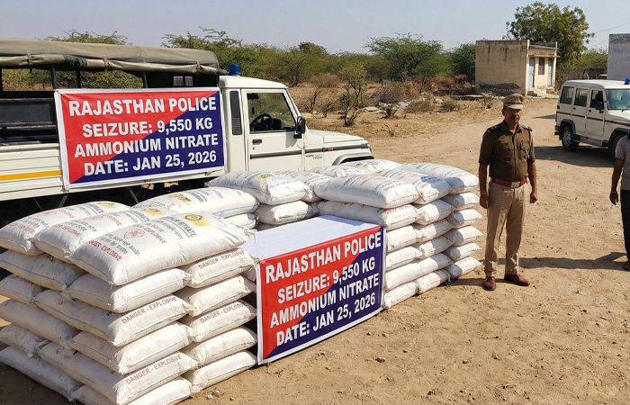 ગણતંત્ર દિવસની સુરક્ષાને ધ્યાનમાં રાખીને રાજસ્થાન પોલીસ હાઈ એલર્ટ પર છે. આ દરમિયાન નાગૌર જિલ્લાના થાવલા પોલીસ સ્ટેશન વિસ્તારમાં પોલીસની ડિસ્ટ્રિક્ટ સ્પેશિયલ ટીમ (DST) અને સ્થાનિક પોલીસે સંયુક્ત ઓપરેશન હાથ ધર્યું હતું. હરસૌર ગામમાં એક ફાર્મ હાઉસ પર દરોડો પાડીને પોલીસે આશરે 10000 કિલોગ્રામ (9550 કિગ્રા) ગેરકાયદે એમોનિયમ નાઈટ્રેટ જપ્ત કર્યું છે. રાજ્યમાં વિસ્ફોટકોની આ અત્યાર સુધીની સૌથી મોટી રિકવરી માનવામાં આવે છે.
