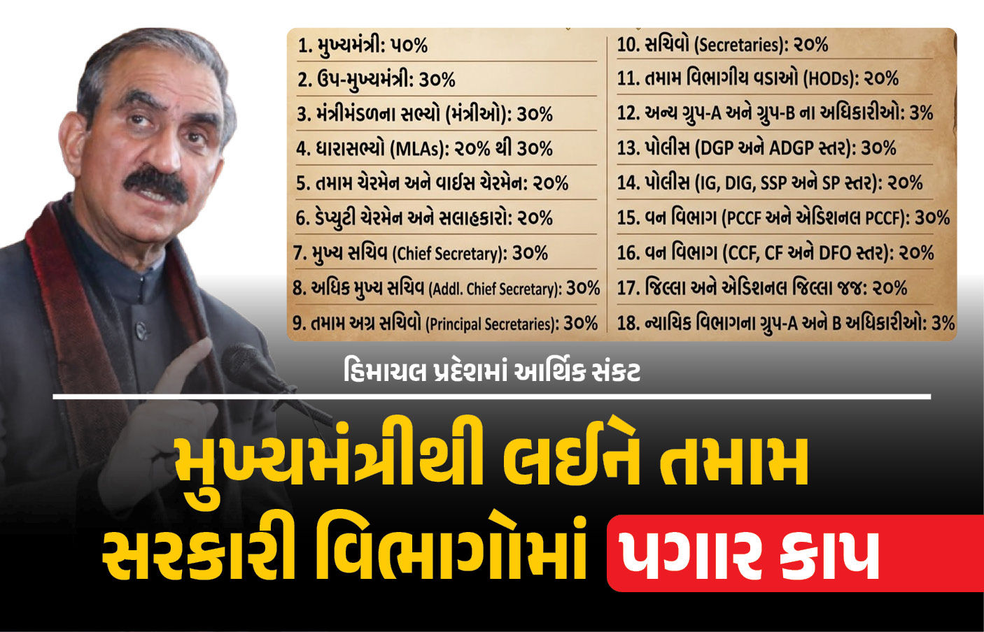 Himachal Pradesh Financial Crisis : હિમાચલ પ્રદેશના મુખ્યમંત્રી સુખવિંદર સિંહ સુક્ખૂએ બજેટ દરમિયાન મુખ્યમંત્રી, ધારાસભ્યો, જિલ્લાના ન્યાયાધીશો અને સરકારી અધિકારીઓના પગાર પર કાપ મુકવાની જાહેરાત કરી છે. રાજ્યની ગંભીર આર્થિક સ્થિતિને ધ્યાને રાખી મુખ્યમંત્રીનો 50 ટકા પગાર, નાયબ મુખ્યમંત્રી અને મંત્રીમંડળમાં સામેલ મંત્રીઓનો 30 ટકા, ધારાસભ્યોનો, 20 ટકા અને સરકારી અધિકારીઓનો 30 ટકા પગાર કામચલાઉ ધોરણે અટકાવી દેવાયો છે. સરકારે આગામી છ મહિના સુધી પૂરો પગાર આપવા પર રોક લગાવી દીધી છે. આ ઉપરાંત જિલ્લાના ન્યાયાધીશોનો 30 ટકા પગાર અટાકીવ દેવાયો છે.