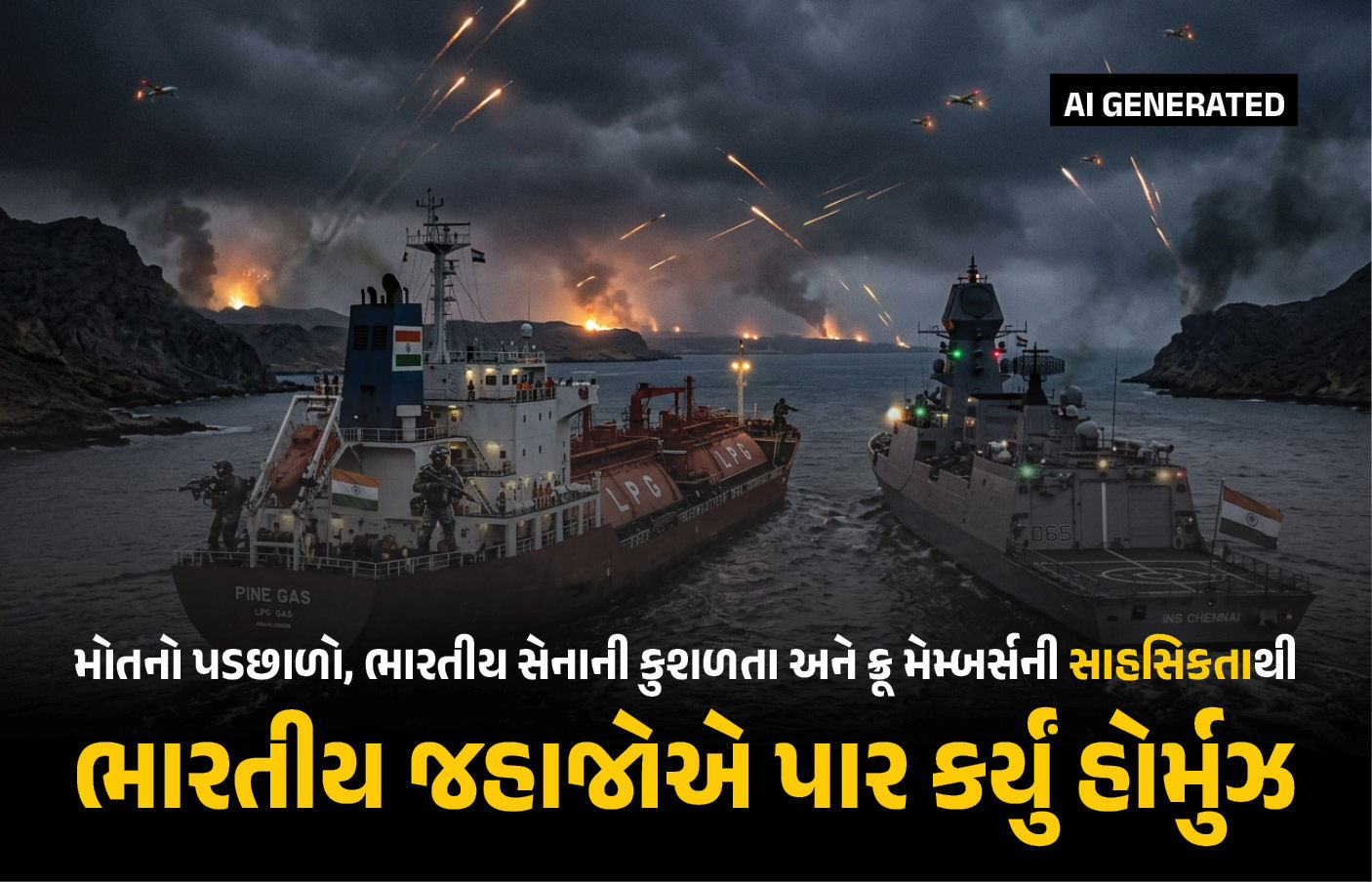 Indian Navy Rescues LPG Tanker : અમેરિકા-ઈઝરાયલ અને ઈરાનના યુદ્ધ વચ્ચે LPG ભરેલા ભારતીય જહાજોએ હોર્મુઝ જળમાર્ગ સુરક્ષિત રીતે પાર કરી લીધું છે. આ જહાજો ભારે સુરક્ષા બંદોબસ્ત વચ્ચે તેમજ ભારતીય સેનાની કુશળતાના કારણે અને સેનાની મદદથી ઓમાનના અખાતથી અરબી સમુદ્ર સુધી લગભગ 20 કલાક સુધી રક્ષણ કર્યા બાદ ખતરનાક હોર્મુઝ જળમાર્ગ પાર કરી લીધો છે.