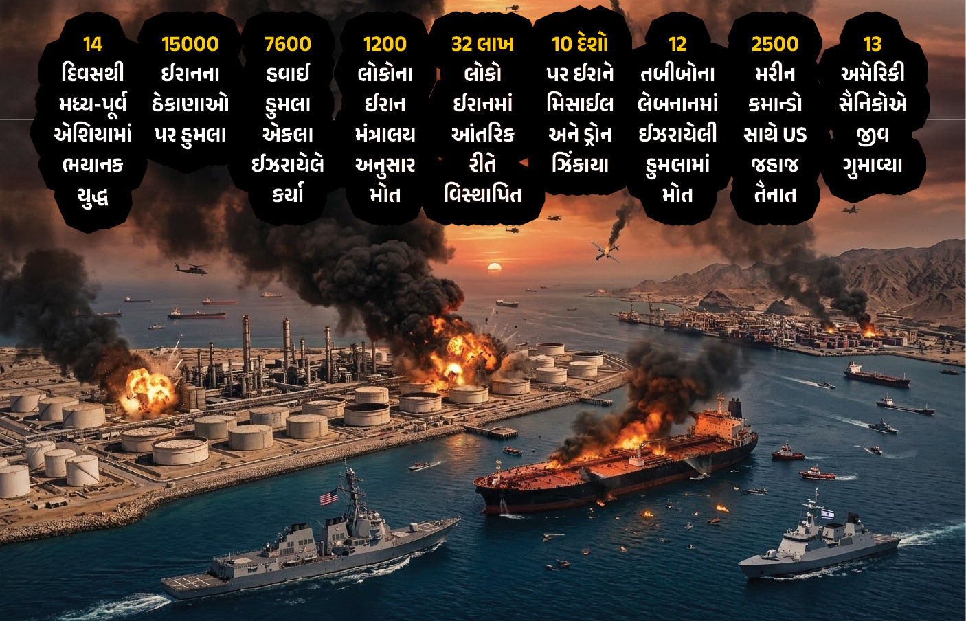 28 ફેબ્રુઆરીથી શરૂ થયેલા 'ઓપરેશન એપિક ફ્યુરી'માં અત્યાર સુધીમાં ઈરાનના 15000થી વધુ ઠેકાણાઓ પર હુમલા કરવામાં આવ્યા છે. ઈઝરાયેલે એકલા હાથે 7600થી વધુ હવાઈ હુમલા કરીને ઈરાનના મિસાઈલ પ્રોગ્રામને તોડી પાડવાનો પ્રયાસ કર્યો છે. ઈરાનના આરોગ્ય મંત્રાલય અનુસાર 1200થી વધુ લોકોના મોત થયા છે અને 32 લાખથી વધુ લોકો આંતરિક રીતે વિસ્થાપિત થયા છે. ઈરાને પણ વળતો જવાબ આપતા 10થી વધુ દેશો પર મિસાઇલ અને ડ્રોન ફેંક્યા છે.