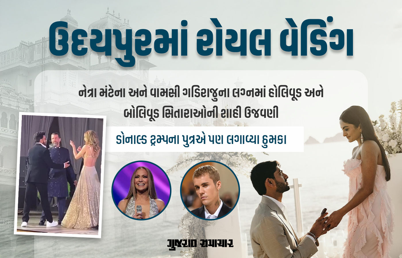Udaipur’s ‘Wedding of the Year’: ‘સિટી ઓફ લેક્સ’ ઉદયપુરમાં આ વર્ષના સૌથી ભવ્ય લગ્નનું આયોજન થયું છે. અમેરિકન ફાર્મા અબજોપતિ રામા રાજુ મંટેનાની દીકરી નેત્રા મંટેના અને ટેક વ્યવસાયી વામસી ગડિરાજુના શાહી લગ્નને ‘વેડિંગ ઓફ ધ યર’ ગણવામાં આવી રહ્યા છે. ત્રણ-ચાર દિવસ સુધી ચાલનારા આ અત્યંત ખર્ચાળ લગ્નોત્સવમાં સામેલ થવા માટે હોલિવુડના સુપરસ્ટાર્સ જેનિફર લોપેઝ અને જસ્ટિન બીબરથી લઈને બોલિવુડના હૃતિક રોશન અને રણવીર સિંહ સુધીના સિતારાઓ ઉદયપુર પહોંચી ગયા છે. અમેરિકાના રાષ્ટ્રપતિ ડોનાલ્ડ ટ્રમ્પના પુત્ર ડોનાલ્ડ ટ્રમ્પ જુનિયર પણ આ લગ્ન માણવા માટે ભારત આવ્યા છે.