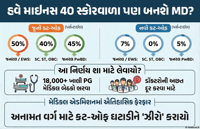 NEET PG cut-off: 'નેશનલ બોર્ડ ઓફ એક્ઝામિનેશન ઇન મેડિકલ સાયન્સ' (NBEMS) એ NEET PG 2025 ના ક્વોલિફાઇંગ પર્સન્ટાઇલમાં મોટો ઘટાડો કરવાની જાહેરાત કરી છે. આ નિર્ણયથી હવે હજારો વધુ MBBS સ્નાતકો MD અને MS ની બેઠકો માટે સ્પર્ધા કરી શકશે. મેડિકલ PG કોર્સિઝમાં 18,000 થી વધુ ખાલી બેઠકો ભરવા માટે આ નિર્ણય લેવાયો છે. જો કે નવી કટ ઓફ ઇશ્યુ કરવામાં આવી છે તે મામલે પણ વિવાદ પેદા થઇ ગયો છે. નિષ્ણાતોનું માનવું છે કે, ક્વોલિફાઇંગ સ્કોર આટલો ઓછો રાખવાથી કોઈ પણ વ્યક્તિ નીટ-પીજીમાં એડમિશન મેળવી શકશે, જે ખૂબ જ જોખમી સાબિત થઇ શકે છે.
