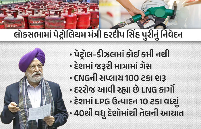 Indian Petroleum Minister On Fuel-LPG-CNG Crisis : ઈરાન-ઈઝરાયલ વચ્ચે ચાલી રહેલા યુદ્ધના કારણે મધ્ય-પૂર્વમાં સર્જાયેલી અસ્થિરતાની અસરો ભારત પર પડવાની આશંકાઓ વચ્ચે કેન્દ્ર સરકારે સ્થિતિ સ્પષ્ટ કરી છે. કેન્દ્રીય પેટ્રોલિયમ અને પ્રાકૃતિક ગેસ મંત્રી હરદીપ સિંહ પુરીએ ગુરુવારે (12 માર્ચ) મહત્ત્વનું નિવેદન આપતા જણાવ્યું કે, ‘દેશમાં પેટ્રોલ, ડીઝલ અને કેરોસીનની સપ્લાય સંપૂર્ણપણે સામાન્ય છે અને કોઈપણ પ્રકારની અછત નથી. કાચા ઓઇલનો પર્યાપ્ત જથ્થો ઉપલબ્ધ છે અને નાગરિકોએ ગભરાવાની કે સંગ્રહખોરી કરવાની કોઈ જરૂર નથી.’