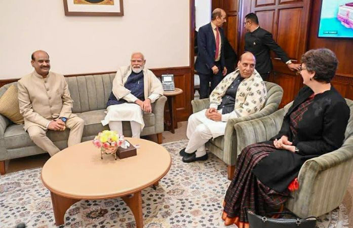 Chai pe Charcha in Parliament: સંસદના શિયાળુ સત્રમાં સત્તાપક્ષ અને વિપક્ષ વચ્ચે ચાલેલી તીખી ચર્ચાઓ અને વિરોધ પ્રદર્શનો બાદ, શુક્રવારે બંને ગૃહોની કાર્યવાહી અનિશ્ચિતકાળ માટે સ્થગિત કરી દેવામાં આવી હતી. સત્રના સમાપન બાદ, લોકસભા સ્પીકર ઓમ બિરલાના કક્ષમાંથી એક એવી તસવીર સામે આવી છે જે લોકશાહીની સુંદરતા દર્શાવે છે. આ તસવીરમાં વડાપ્રધાન નરેન્દ્ર મોદી, રક્ષા મંત્રી રાજનાથ સિંહ અને વાયનાડના પ્રથમ વખતના સાંસદ પ્રિયંકા ગાંધી એકસાથે બેઠેલા જોવા મળ્યા હતા.
