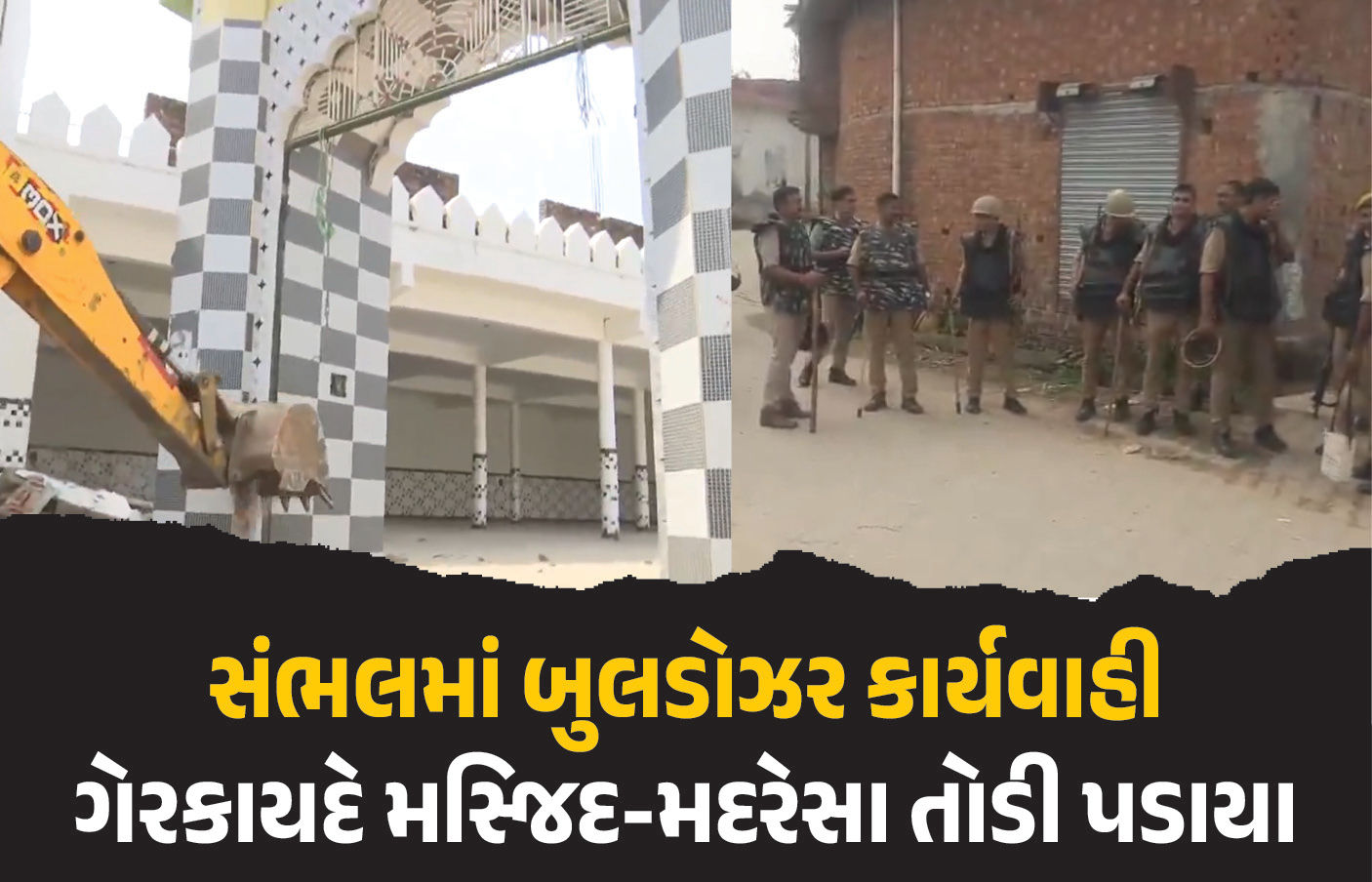 Madrasa, Mosque Demolished in Sambhal : ઉત્તર પ્રદેશના સંભલ જિલ્લામાં વહીવટીતંત્ર દ્વારા સરકારી જમીન પર કરાયેલા અવૈધ બાંધકામને તોડી પાડવાની મોટી કાર્યવાહી શરૂ કરવામાં આવી છે. ભારે પોલીસ બંદોબસ્ત હેઠળ અને ડ્રોન કેમેરાની સતત દેખરેખ વચ્ચે મસ્જિદ, મદરેસા અને મેરેજ હોલ પર બુલડોઝર ચલાવવામાં આવી રહ્યા છે.