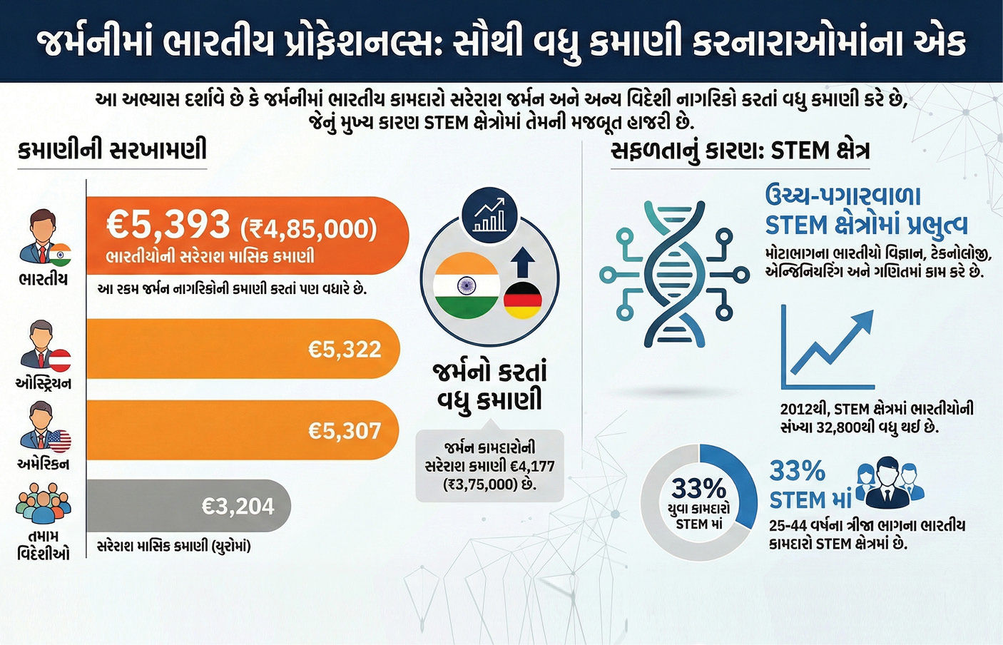 આ ઉચ્ચ કમાણીનું મુખ્ય કારણ એ છે કે જર્મનીમાં રહેતા ઘણાં ભારતીયો ઊંચો પગાર આપતા વિજ્ઞાન, ટૅક્નોલૉજી, એન્જિનિયરિંગ અને ગણિત (STEM) જેવા ક્ષેત્રોમાં કામ કરે છે. વર્ષ 2012થી અત્યાર સુધીમાં STEM ક્ષેત્રમાં કામ કરતાં ભારતીયોની સંખ્યા 9 ગણી વધીને 32,800થી વધારે થઈ ગઈ છે. 25થી 44 વર્ષ વયના ભારતીય કામદારોમાંથી 33% STEM ક્ષેત્રમાં છે, જે અન્ય કોઈપણ સમૂહ કરતાં ઘણું વધારે છે.