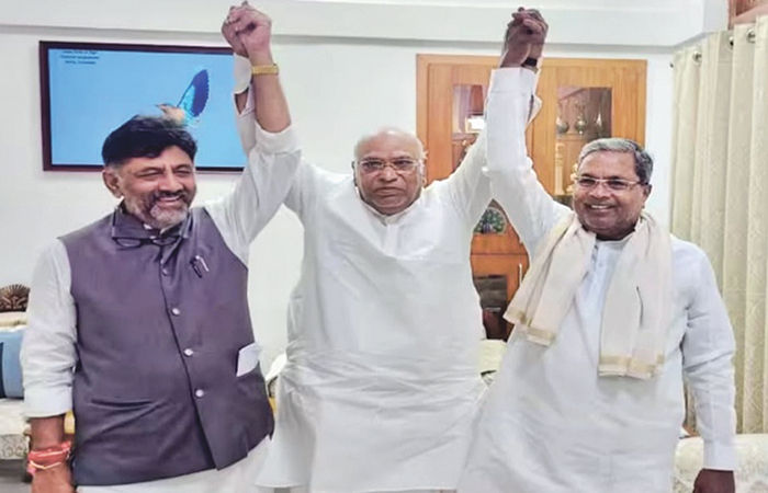 - કલહ: (ડાબેથી) ડી.કે. શિવકુમાર, મલ્લિકાર્જુન ખડગે અને સિધ્ધારમૈયા