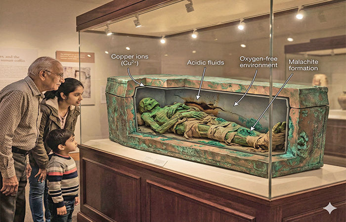 આ સંશોધન ભવિષ્યમાં આર્કિયોલોજિસ્ટ્સને અને મ્યુઝિયમ ક્યુરેટર્સને મદદ કરશે. દફનવિધિની પદ્ધતિઓ, સામાજિક પ્રથાઓ, અને રાસાયણશાસ્ત્રીય પ્રક્રિયાઓ વિશે આપણે વધુ શીખી શકીએ છીએ. દરેક તાંબાની વસ્તુ એક વાર્તા કહે છે - સદીઓથી ચાલતી રાસાયણિક પ્રતિક્રિયાઓની વાર્તા. હવે વૈજ્ઞાનિકો આવા ફેરફારોને ''નુકસાન'' તરીકે નહીં, પરંતુ ''મૂલ્યવાન માહિતી'' તરીકે જોશે. શું ભવિષ્યમાં આપણે જાણી જોઈને ધાતુઓનો ઉપયોગ, માનવ અવશેષોને સાચવવા માટે કરી શકીએ ખરાં? શું અન્ય ધાતુઓ - જેમ કે ચાંદી, સોનું, અથવા લોખંડ - પણ આવી જ રીતે શરીરને રૂપાંતરિત કરી શકે? અને શું આ પદ્ધતિનો ઉપયોગ આધુનિક સંરક્ષણ વિજ્ઞાનમાં અને મ્યુઝિયમોમાં થઈ શકે? જ્યારે આપણે જૂની તાંબાની મૂર્તિઓ કે પ્રાચીન મંદિરોના ઘંટ પર લીલો કાટ જોઈએ છીએ, ત્યારે શું આપણે તેને નવી દ્રષ્ટિએ જોઈ શકીએ - કે તે માત્ર કાટ નથી, પરંતુ સમયની સાથે રસાયણશાસ્ત્રની અદ્ભુત ''લીલા'' છે?