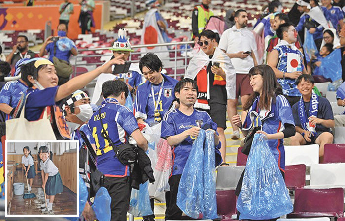 જાપાનની ટીમ મેચ હારી જાય કે જીતે, મેચ પૂરી થયા પછી જાપાની ચાહકો સ્ટેડિયમ છોડતા પહેલા પોતાની સાથે લાવેલી વાદળી રંગની કચરાની થેલીઓ કાઢે છે. તેઓ આખા સ્ટેડિયમમાં ફરીને પ્રેક્ષકો દ્વારા ફેંકાયેલો કચરો, ખાલી બોટલો અને ખાધેલી વસ્તુઓના રેપર જાતે સાફ કરે છે.જાપાને આવા એક વર્લ્ડ કપમાં ફૂટબોલ જગતમાં દિગ્ગજ મનાતી જર્મનીને પરાજય આપીને તેઓના ઇતિહાસની સૌ પ્રથમ આવી જીત હાંસલ કરી હતી. પણ મેચ પુરી થતા બે પાંચ મિનિટની ઉજવણી કરીને જાપાનના જે પ્રેક્ષકો મેચ જોવા આવ્યા હતાં તેઓએ સાથે લાવેલ વાદળી રંગની બેગમાં માત્ર પોતે રાખી મુકેલ બોટલ, બેગ અને અન્ય ખાદ્ય ચીજવસ્તુના રેપર જ નહીં પણ અન્ય દેશના પ્રેક્ષકોએ ફેંકેલ બગાડ પણ વીણી લઈને બેગમાં મૂકી આખુ સ્ટેન્ડ સાફ કરીને સ્ટેડિયમમાંથી વિદાય લીધી હતી.