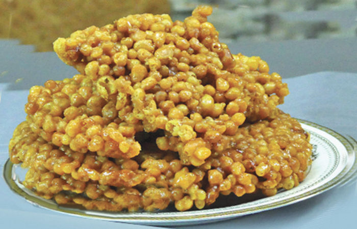 રીત : તલને થોડા શેકીને એક બાજુ મૂકો. ચણાના લોટમાં પાણી નાખી બુંદીનું ખીરું તૈયાર કરો. હવે તેલ ગરમ કરી તેમાંથી બુંદી પાડો. ગોળની ચાસણી બનાવો. ચાસણી થોડી ઠંડી પડે એટલે એમાં બુંદી નાખી ૧૫-૨૦ મિનિટ સુધી રહેવા દો. હવે માવાને શેકી બરાબર મસળી નાખો. ચાસણીમાંથી બુંદી કાઢી લો. તેમાં તેલ, માવો અને એસેન્સ નાખી હલાવો. એમાં જરૂર પ્રમાણે ગોળની થોડી ચાસણી પણ નાખો. હવે બધુ બરાબર હલાવી થાળી કે ડિશમાં પાથરી દો. તે ઠરી જાય એટલે તેના ચોસલા કાપી લો. તમે ઈચ્છો તો એના લાડુ પણ વાળી શકો છો.
