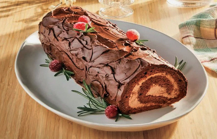 ઓવન ગરમ કરો. સ્વિસ રોલ ટિનમાં ઘી કે તેલ લગાવી તેમાં ગ્રીસપ્રૂફ પેપર પાથરો તેના પર કેકનું મિશ્રણ પાથરો અને ૧૦ મિનિટ સુધી કે આછા બ્રાઉન રંગનું થાય ત્યાં સુધી બેક કરો. પછી બહાર કાઢી લઈ તરત એક લીસા પેપર પર ટ્રે ઉલટાવી લો ધીરેથી કાગળ હટાવીને કિનારેથી કાપી લો. તેના પર જામ પાથરો અને તળિયાના કાગળની મદદથી ગોળ વાળી દો હવે આ રોલને કિચન ટોવેલમાં લપેટીને એક કલાક સુધી ઠંડો થવા દો. કેક ઠંડી થાય એટલે બે ભાગમાં કાપો. તેના પર બટર આઈસિંગ લગાવો. તથા કાંટા વડે લાકડાની છાલનો આકાર આપો.
