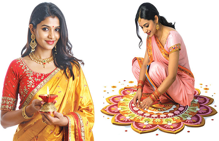 દિવાળીમાં રંગોળીનું વિશિષ્ટ મહત્ત્વ છે. રંગોના બદલે ફૂલોથી રંગોળીની સજાવટ કરશો તો આકર્ષણનું કેન્દ્ર બની જશે. તમે પણ તમારા શૃંગારમાં ફૂલોના ઉપયોગ કરી શકો છો. અંબોડો ઉત્સવને ચિરસ્મરણિય બનાવી શકો! વાળી તેમાં એકાદ ગુલાબનું ફૂલ સરસ લાગશે. લાંબા ચોટલામાં ડોલરના શ્વેત ફૂલોની સેર અદ્ભુત લાગશે.