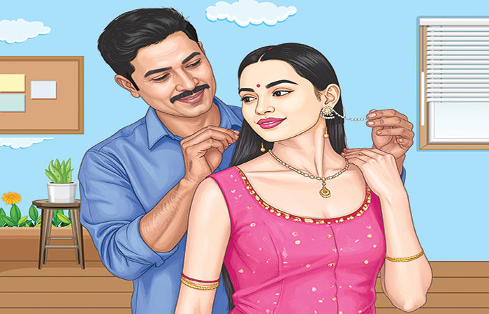 જેવો તારો હુકમ...... કહીને પ્રકાશ પ્રતિભાની પીઠ પાછળ ગોઠવાઇ ગયો. એણે થોડીવાર સુધી પત્નીની પીઠ પ્રેમથી પસવારે રાખી અને પછી એના કાનમાં એરીંગ પહેરાવી દીધાં.. જીરુ, સાચુ કહેજે મને નવા એરીંગ કેવા છે.