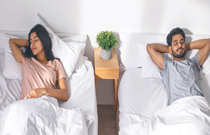 રૂમ શેર કરતા કપલોને જાણ હશે કે ઊંઘવાના થોડા કલાકો દરમ્યાન કેવું ચીડિયાપણુ વધી જાય છે. પત્ની સૂતા પહેલા ફિલ્મ જોવા ઈચ્છતી હોય છે જ્યારે પતિને પુસ્તક વાંચવા શાંતિની જરૂર હોય છે. એક પાર્ટરને ઉષ્માની ઝંખના હોય છે જ્યારે બીજાને ઠંડો પવન જોઈતો હોય છે. નસકોરા, આળોટવું, ઓઢીને સૂવુ અને મોડી રાત્રે ફોન પર વાતો કરવાથી ઘર્ષણ થાય છે. આ બાબતો ભલે નજીવી લાગે, પણ તેનાથી સમય જતા તણાવ વધ્યા કરે છે, અને પછી એવી નારાજગી સર્જે છે જે બંને પાર્ટનરો વચ્ચે એક દડાની જેમ ફંગોળાયા કરે છે.