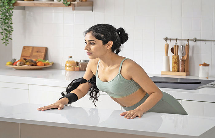 આ વ્યાયામ માટે એક કેબિનેટની જરૂર પડશે. કેબિનેટનું ઉપરનું ખાનું ખોલી બંને હાથ વડે તેનોટેકો લો. પગની એડી ઊંચી રાખો અને હળવેકથી ખુરશીમાં બેસતા હો એ રીતે નીચેની તરફ ઝુકો.