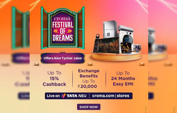 Croma Offers : ક્રોમા ટાટા એન્ટરપ્રાઇઝ Croma's Festival of Dreams ઓફર લાવી છે. જેમાં ટીવી, વોશિંગ મશીન, લેપટોપ અને સ્માર્ટફોન સહિત અનેક આઈટમ પર મોટું ડિસ્કાઉન્ટ ઑફર આપી રહી છે. તમામ કેટેગરીમાં આકર્ષક ઓફર સાથે 15% સુધીનું કેશબેક, રૂ 20,000 સુધી એક્સચેન્જ બેનીફીટ તેમજ 24 મહિના સુધી સરળ EMIની સુવિધા મળી રહી છે.