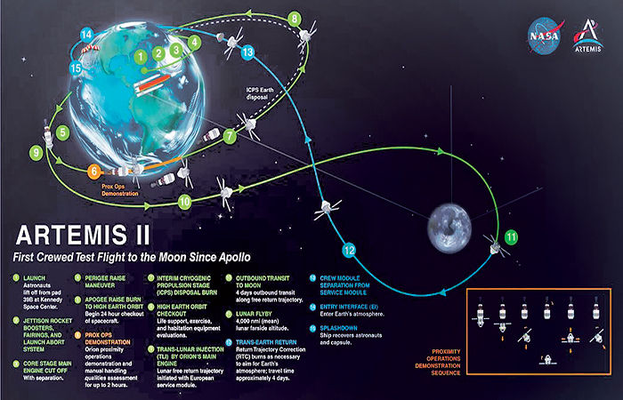 નાસાનાં સૂત્રોએ એવી માહિતી આપી છે કે અમારું અર્ટિમસ-૨ મિશન ૧, એપ્રિલે સાંજે ૬:૩૪ વાગે (ભારતીય સમય મુજબ ૨, એપ્રિલ : વહેલી સવારે ૩ : ૫૪) ફ્લોરિડાના કેન્નેડી સ્પેસ સ્ટેશન પરથી ચાર અવકાશયાત્રીઓ સાથે ચંદ્રની યાત્રાએ રવાના થશે. ચારેય અવકાશયાત્રીઓ ઓરાયન નામના અવકાશયાનમાં ચંદ્ર પ્રવાસ કરશે. ઓરાયન અવકાશયાનને સ્પેસ લોન્ચ સિસ્ટમ(એસ.એલ.એસ.) રોકેટ દ્વારા અંતરિક્ષમાં રવાના થશે. એસ.એલ.એસ. રોકેટ ૩૨ માળના કોઇ ગગનચુંબી ઇમારત જેટલું મહાકાય અને તોતિંગ છે.