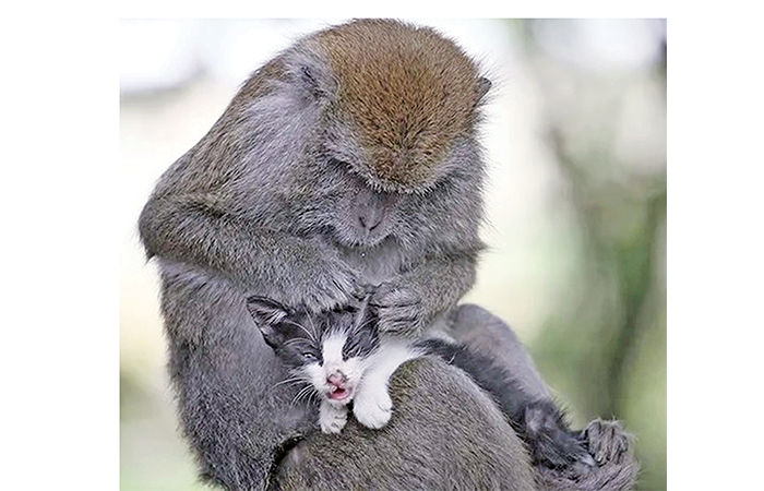 જં ગલી જનાવરોના હૃદયમાં પણ કુદરતે લાગણીનો ભંડાર મૂકેલો હોય છે. બચ્ચાંઓ પર વાત્સલ્ય વરસાવવામાં તેઓ મનુષ્યોથી જરાય ઓછા નથી હોતા, પરંતુ ઍક્સપર્ટ ફોટોગ્રાફરોની ચબરાક આંખ ક્યારેક એવાં દુર્લભ દ્રશ્યોને એમના કેમેરામાં ક્લિક કરી લેતી હોય છે ત્યારે ખબર પડે કે જનાવરો અન્ય પ્રાણીઓનાં બચ્ચાંઓ પ્રત્યે પણ અપાર લાગણી વરસાવી શક્તા હોય છે. સાથેની તસવીરમાંની વાંદરી એક બિલાડીના બચ્ચાની માની જવાબદારી નિભાવી રહી છે. નિરાધાર બનેલા બચ્ચાએ પણ તેના પર હેત વરસાવનારને જ માતા તરીકે સ્વીકારી લીધી છે. માતા અને બચ્ચાની આ અસાધારણ જોડી ઇન્ડોનેશિયાના તાંજુંગ પુટિંગ નેશનલ પાર્કમાં જોવા મળી હતી. કોરિની નામની આ વાંદરી બિલાડીના બચ્ચા પ્રત્યે આટલી પ્રેમાળ બની એની પાછળ પણ એક ઇતિહાસ છે. પાર્કના કર્મચારીઓનું કહેવું છે કે નાનપણમાં તે પણ પોતાની માતાને ખોઈ બેઠી હતી. તેથી મા વિનાનું બાળપણ કેવું અકળાવનારું હોય છે એ તે બરાબર જાણે છે. તેના ભૂતકાળનો ફાયદો બિલાડીના આ બચ્ચાને એવો થયો કે એને મા જેવો પ્રેમ મળ્યો. આ બચ્ચું માના પ્રેમથી વંચિત રહી ન જાય એની કોરિનીએ બરાબર તકેદારી રાખી છે.