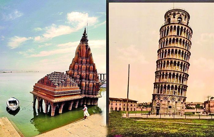 અત્યારે આ ટાવર યાદ આવવાનું બીજું કારણ છે. આપણે ભારતીયો ભવ્ય ભૂતકાળની મોટી મોટી ડંફાસો મારીએ છીએ પરંતુ આપણાં અજોડ કહી શકાય એવાં પ્રાચીન શિલ્પ-સ્થાપત્યોની ક્યારેય કાળજી કરતા નથી. પીસાના ટાવરને ટક્કર મારે એવું એક ઢળતું મંદિર વારાણસી (કાશી)માં છે. એ રત્નેશ્વર મહાદેવ મંદિર તરીકે ઓળખાય છે. સ્થાનિક લોકો એને માતૃઋણ મંદિર તરીકે પણ ઓળખે છે. એના ઢાળને કારણે એને કાશી કરવટ પણ કહે છે. (હિન્દીમાં કરવટ એટલે ઢાળ અથવા ઝુકાવ કે પડખું. કરવટ બદલના એટલે પડખું ફરવું) એનો ઢાળ એવો છે કે એ લગભગ વર્ષના આઠ નવ મહિના પુણ્યસલિલા ગંગામાં ડૂબેલો રહે છે એટલે એના દર્શન કરવાની શક્યતા રહેતી નથી.