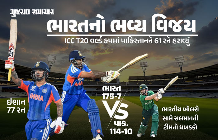 ભારતે T20 વર્લ્ડ કપમાં પાકિસ્તાનને રેકોર્ડ 8મી વખત હરાવી દીધું છે. ભારતની 61 રનથી ભવ્ય જીત થઈ છે. ભારતીય બેટર ઈશાન કિશને તોફાની 77 રનની ઈનિંગ રમી હતી. જેને લઈને તેને મેન ઓફ ધ મેચનો ખિતાબ મળ્યો છે. ભારતીય બોલરોએ પણ શ્રેષ્ઠ પ્રદર્શન કર્યું છે.