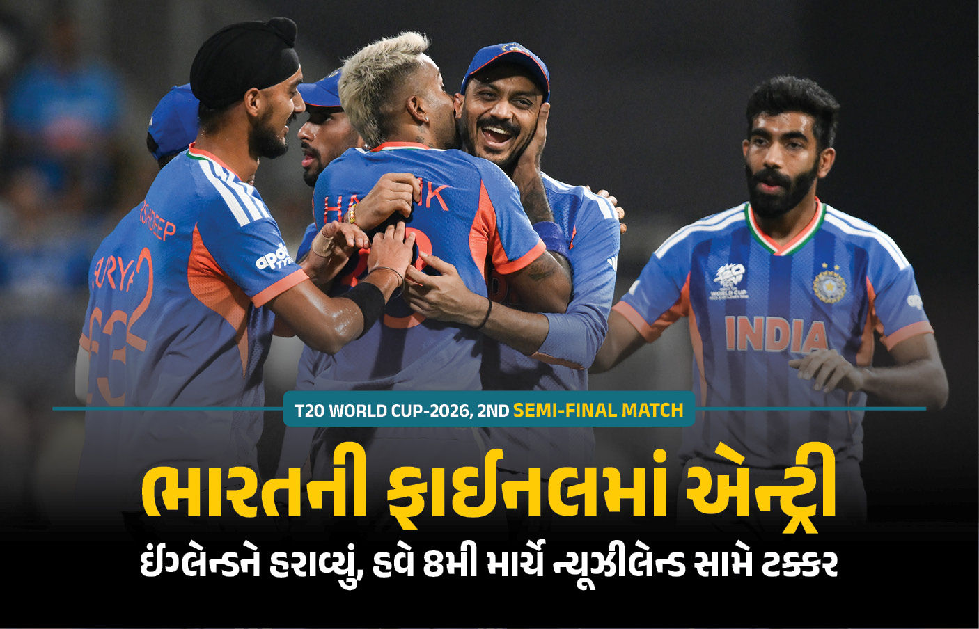 T20 World Cup 2nd Semi-Final at Mumbai, India vs England Match : ટી20 વર્લ્ડકપ-2026ની બીજી સેમિ ફાઈનલમાં ભારતે ઈંગ્લેન્ડને હરાવી ફાઈનલમાં એન્ટ્રી કરી લીધી છે. ઈંગ્લેન્ડે ટોસ જીતીને ભારતને પહેલા બેટિંગ આપી હતી, જેમાં ટીમ ઈન્ડિયાએ નિર્ધારીત 20 ઓવરમાં સાત વિકેટે 253 રન નોંધાવ્યા હતા, જેના જવાબમાં ઈંગ્લેન્ડની ટીમ 20 ઓવરમાં સાત વિકેટે 246 રન કરી શકી હતી. આજની મેચ સંજૂ સેમસને ફરી વિસ્ફોટ ઈનિંગ રમી ફિફ્ટી ફટકારી હતી. જ્યારે મિડલમાં આવેલા હાર્દિક પંડ્યા, શિવમ દુબે અને તિલક વર્માએ પણ દમદાર બેટિંગ કરીને ટીમને મજબૂત સ્કોર સુધી પહોંચાડવામાં મહત્ત્વનું યોગદાન આપ્યું હતું. તો ઈંગ્લેન્ડ તરફથી જેકોબ બેથેલે વિસ્ફોટક બેટિંગ કરીને 48 બોલમાં આઠ ફોર અને સાત સિક્સ સાથે 105 રન નોંધાવ્યા હતા.