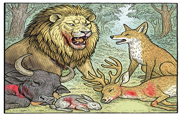 શિયાળ કહે : મહારાજ, આપ તો વનના રાજા છો. આવા સસલામાં ને હરણમાં પહેલો હાથ નાખે એ તો મામુલી કહેવાય. પહેલાં આપ પાડાને ખાઓ.