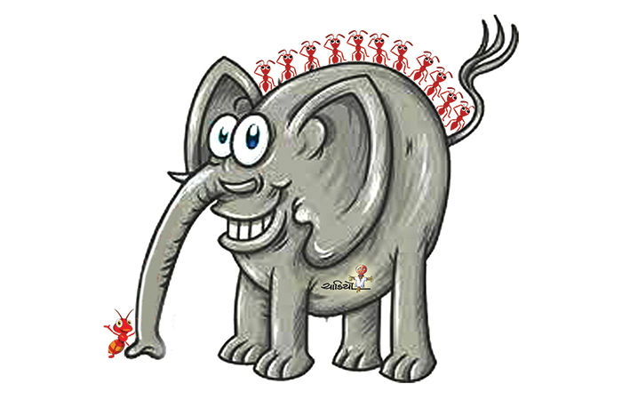 બીજો કહે, તું મારી વાત ઉપર હસે છે, પરંતુ તને ખબર નથી કે કીડી હાથીના કાનમાં ઘૂસી જાય તો હાથી જેવા મોટાં અને કદાવર પ્રાણીના પણ ઘડીકમાં રામ રમી જાય. શક્ય છે કે તને આ વાતની ખબર ન હોય, પણ મેં મારા વડીલો પાસેથી સાંભળી છે.'