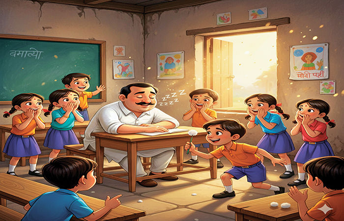 બીજે દિવસે બાળવર્ગમાં આવીને સાહેબ કહે, 'છોકરાંઓ, તમે બીજો પાઠ લખો. હું તમારે માટે મજાની એક વાર્તા બનાવી રાખું છું.'