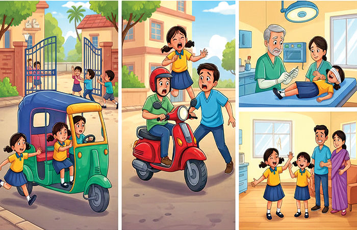 In this way, one month passed. But Parita became laughing, playing, and talking again. She could not go to school for only one week. She fell slightly behind in her studies, but she will surely catch up with the class quickly. This one month, Parita did not let anyone feel burdened. She just kept laughing, playing, dancing, and jumping. Parita's story tells us a lot. After school is over, we should not run like crazy. If an accident occurs, stay calm. During illness, follow dietary restrictions properly. Face pain with courage. From Dr. Jharmarwala, the rickshaw drivers, to the scooter rider who caused the accident, we thank everyone; but however much we praise Parita, it is not enough. Bravo Parita, bravo her parents.